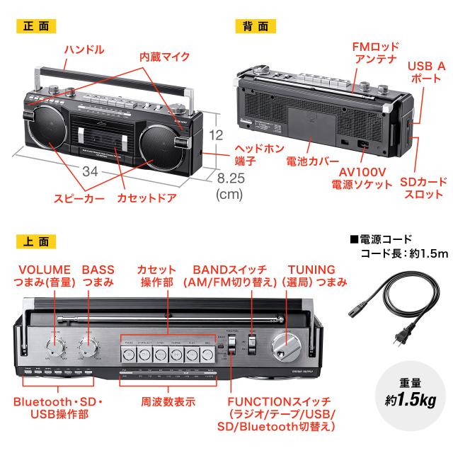 ⇒ご購入の前にご確認下さいカセットテープの音声をデジタル保存できるBluetooth搭載ラジカセ。80年代風の懐かしデザイン。AC電源/単二乾電池で動作。カセットテープやAM/FMラジオの再生などラジカセの基本機能はもちろんのこと、Bluetoothで接続しスピーカーとして使える。USBメモリ/SDカードに保存したMP3音声を再生できる。ブラック。【WEB限定商品】