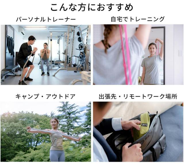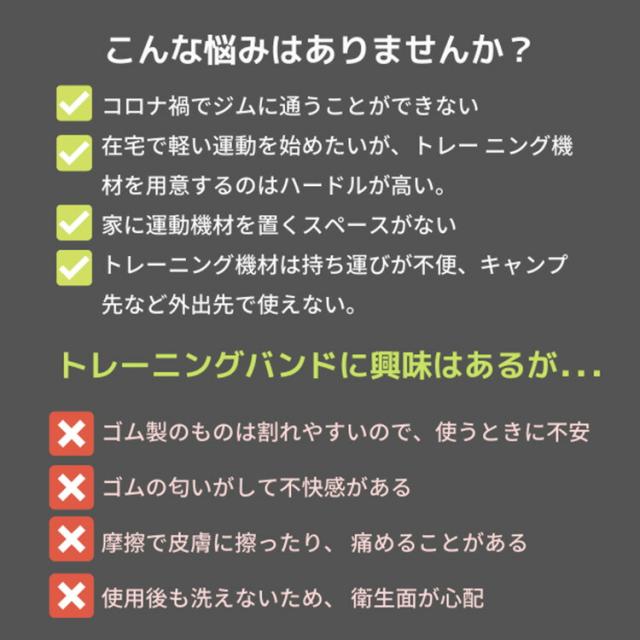 | ■安全面、衛生面を重視するパーソナルトレーナー 破れないかつ洗濯可能だから使いまわしても安心 ■自宅で簡単にトレーニングを始めたい方 ハードルが高い機材より簡単に始められるフィットネスバンド ■キャンプ、アウトドアの時も少し体を動かしたい方 大きな道具は不要!週末のキャンプのお供にも最適です。 ■出張先、リモートワーク場所でも運動したい方 収納に困らないので、外出先でもいつでもトレーニングが可能です。 |