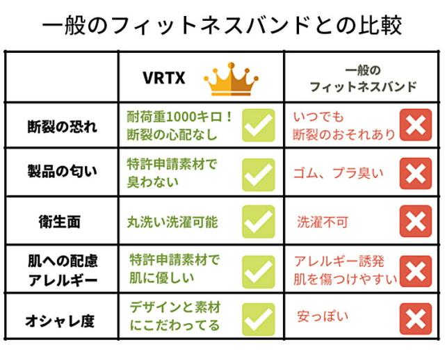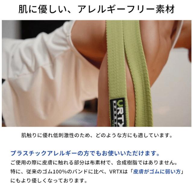 | ●世界初、耐荷重1000キロ!破れないフィットネスバンド 独自のインテリウィーブ・テクノロジー(ラテックス・ゴム繊維+ポリエステル繊維)を用いた「VRTX」は劣化や疲労、外部要因による物理的な損傷に対する体制が非常に高いです。 ※耐久性は引張強度テストでは1万回以上の耐久実績です。 ●肌に優しい、アレルギーフリー素材 「VRTX」は従来のゴムバンドと比較してゴムの使用量が44〜68%少なく、その分を布繊維で置き換えています。 肌触りに優れ、低刺激性のため、どのような方にも適しています。 健康と同様に地球の健康も重視している為、生物分解性のない原材料の使用最大68%削減したのも特長です。 ●丸洗い可能 VRTXは使用後に洗濯機で丸洗できるため衛生的。トレーニングでの皮膚の安全を確保でき、快適なフィットネス環境を整えることができます。さらに丸洗い可能なので、清潔さ・衛生を保つのもとても簡単です。 ●VRTXの強度は、消費者調査を経て設計された7段階の組み合わせで初級者から上級者までお使いいただけます。 ご自分の状況に合わせて最適なバンドをお選びいただけます。 |
