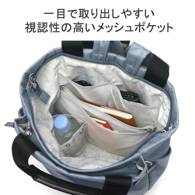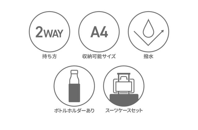 | 仕様 | <外側> ジップポケット(L)×1 ジップポケット(M)×1 └ 内蔵 メッシュポケット(S)×2 メッシュポケット(XS)×2 ジップポケット(M)×1 ポケット(S)×2 <内側> メッシュジップポケット(M)×1 ポケット(M)×1 ポケット(S)×2 ボトルホルダー×1 <付属品> レザーチャーム×1 |
