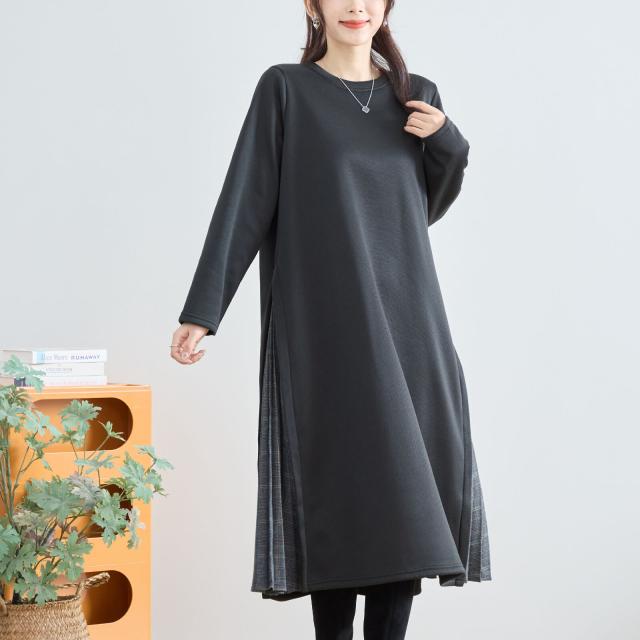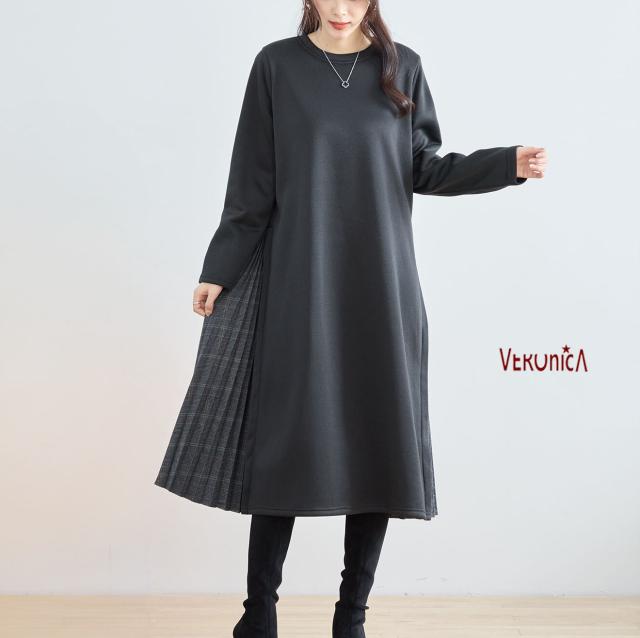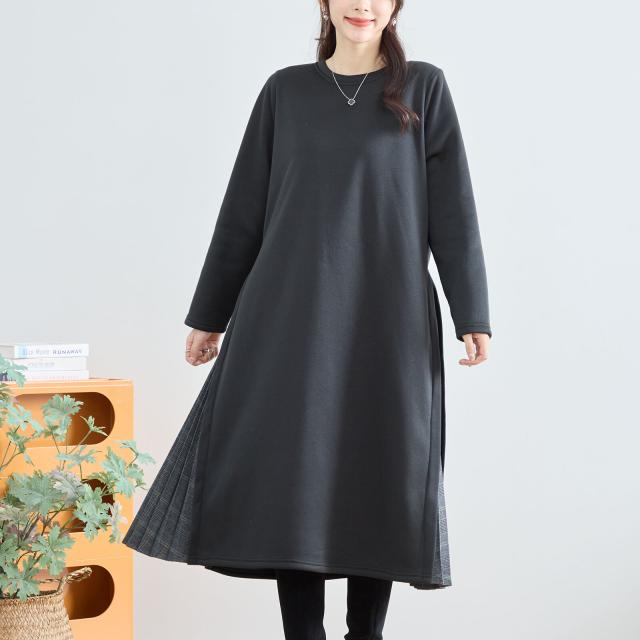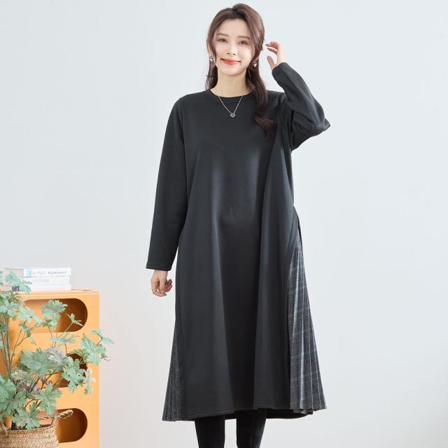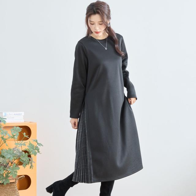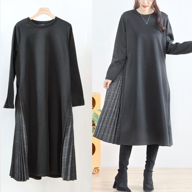 【即納】サイドチエック柄プリーツ切り替えワンピース 厚地 膝下丈 体型カバー 無地 AW 秋冬 新作