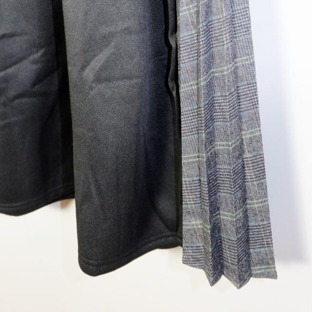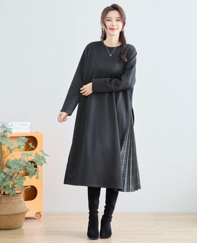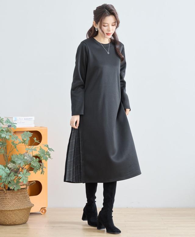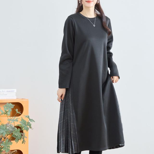 プリーツのチェック柄生地と無地の切り替えワンピース。広がるプリーツが美しく、暖かくて着心地の良いアイテムです。