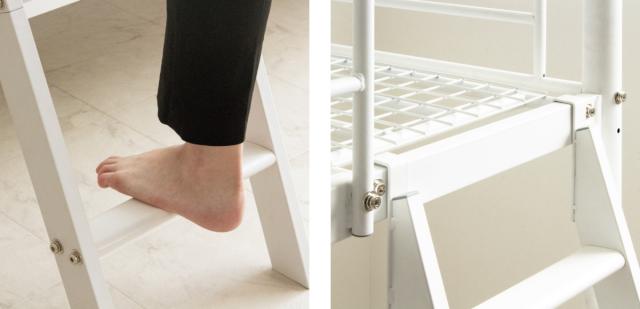 ハシゴの位置は、左右どちらにでも設置可能です。お部屋のレイアウトに合わせて付け替えることができます。ハシゴは足が痛くなりにくい幅広でフラットな形状。毎日の上がり下りだからこそ、快適さにもこだわりました。