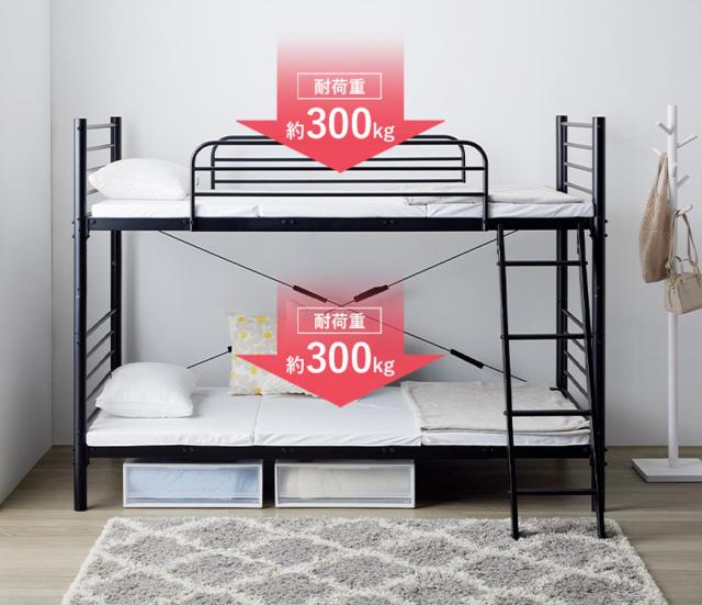 耐荷重300kgの頑丈な構造です。がっしりとしたスチールフレームを使用しぐらつきやガタつきを抑えることで、毎日安心して眠っていただけます。