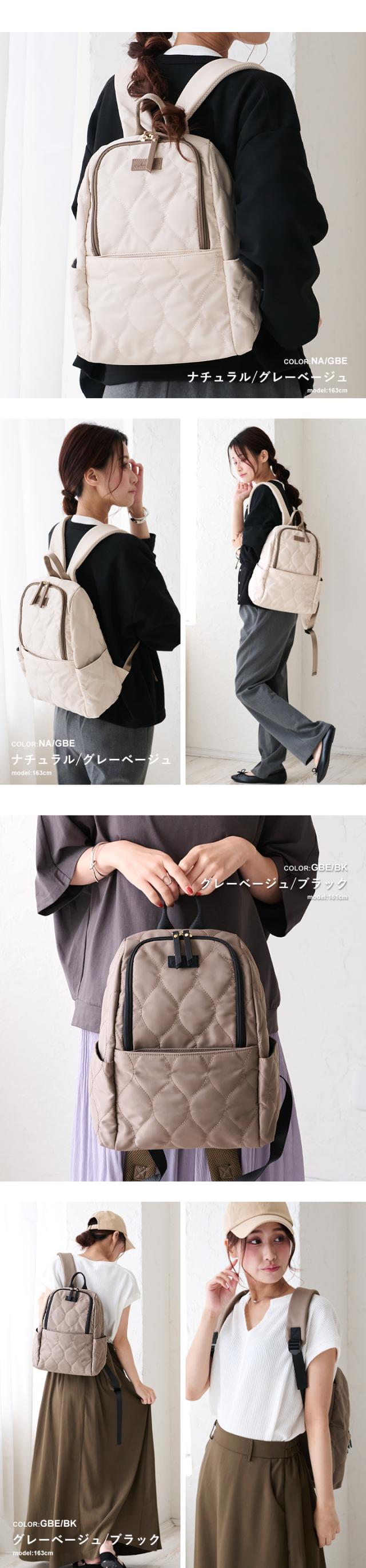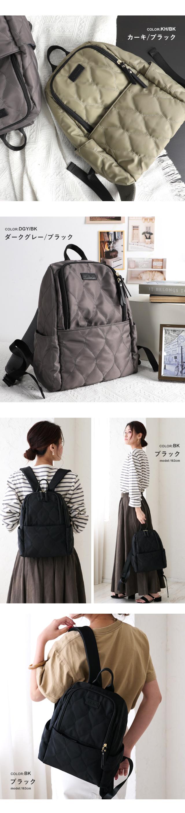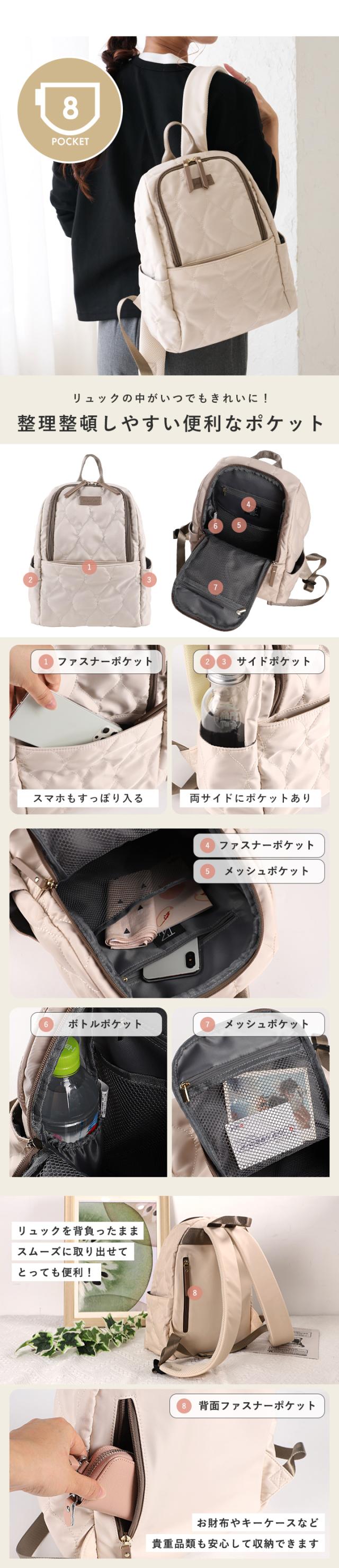 - キルティング模様がお洒落で、開口部分も良いアクセントです。他のリュックと違うので購入しました。ボトルポケットが助かります。