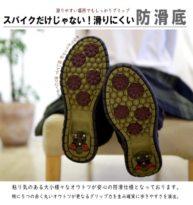 建物の中や、融雪路面にはスパイクをオフ!ツルツルの凍結路面にはWグリップスパイクをオン。