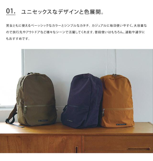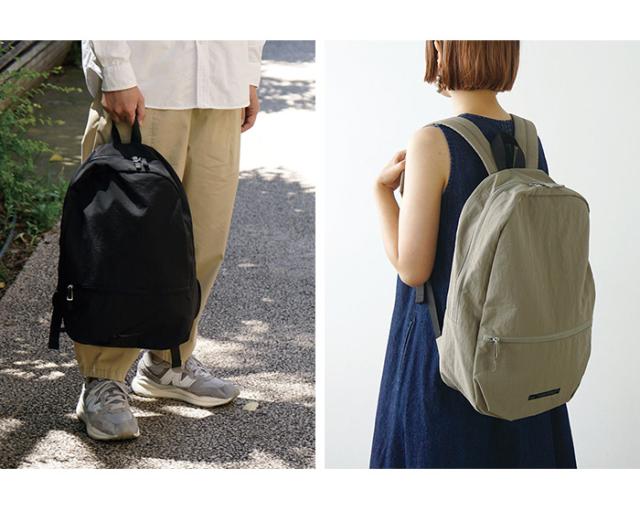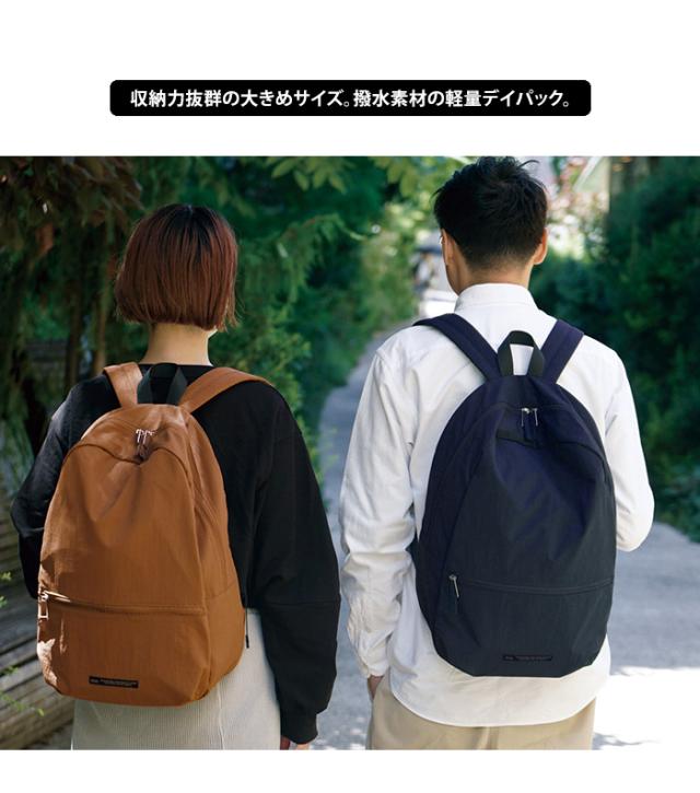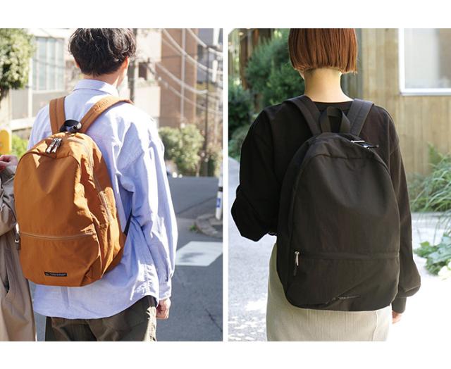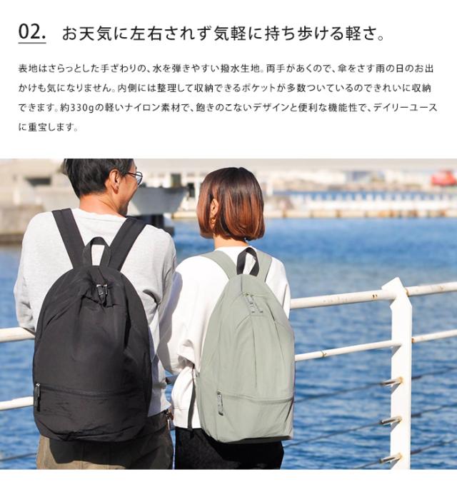 男女ともに使えるベーッシックなカラーとシンプルなカタチ。 カジュアルに毎日使いやすく、大容量なので旅行先やアウトドアなど様々なシーンで活躍してくれます。普段使いはもちろん、通勤や通学にもおすすめです。表地はさらっとした手ざわりの、水を弾きやすい撥水生地。両手があくので、傘をさす雨の日のお出
