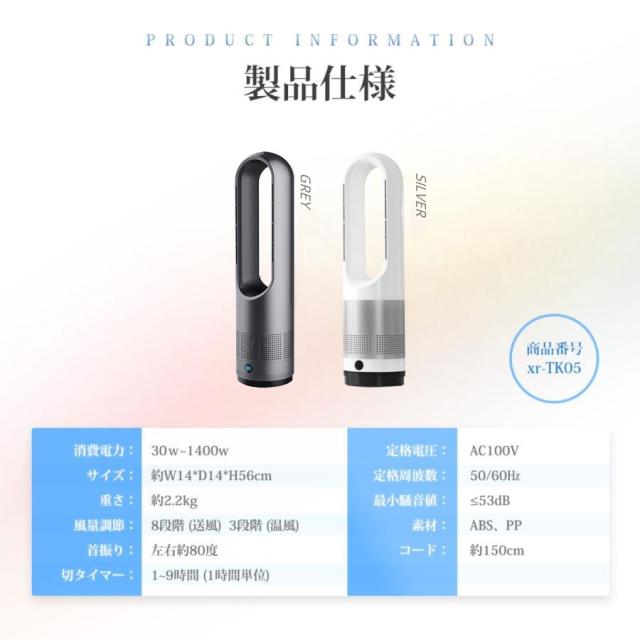 【冷暖兼用/冷風8段階・温風3段階/オールシーズンタイプ】360度吸気口から空気を取り込み、羽根のない楕円形状エアダクトは流線形ループ通気により高速送風。冷風モードはやわらかい感触の微風からパワフルな強風まで8段階風量。風量パターンが時間とともに弱くなる、おやすみモードは就寝時に最適です。温風モードは3段階風量。最大1,400Wの温風でお部屋を暖めます。3段階の温風と8段階の冷風を自由に切り替えることができます、オールシーズンで快適に過ごせます。