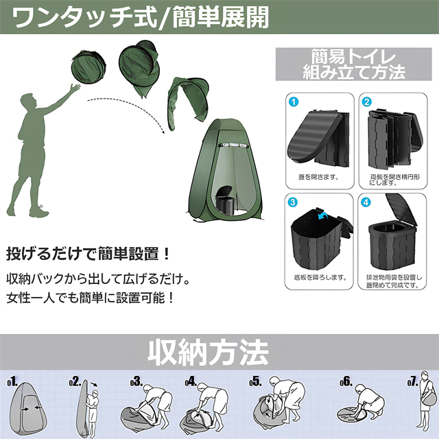アウトドア旅行中はいつでもどこでもトイレを利用することができ、不必要な恥ずかしさや困惑を避けることができます。野外キャンプでも、この仮設トイレを使用することで、快適なトイレ体験を提供し、素晴らしい旅の思い出を作ることができます。