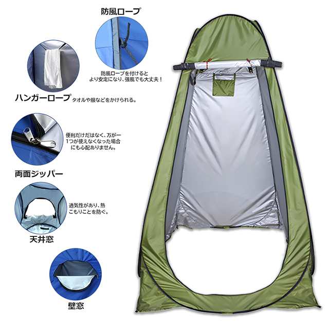 熱気や臭気がこもりにくい設計 通気性をしっかり確保しつつ 開放された状態で空が望める 内部両側に水が溜まらないネットのポケットがあったり 上部にフックとループ 帯状の紐がありハンガーが掛けられたり シャワーでも着替えでも便利な収納スペースがあります 付属のロープでペグまたは砂袋を結び 風で飛ばないようにもできる 【防水 アンチUV】テントは厚手の210Tポリエステル防水生地を使用し 万が一の急な雨にも 慌てることなくお着替え可能です。