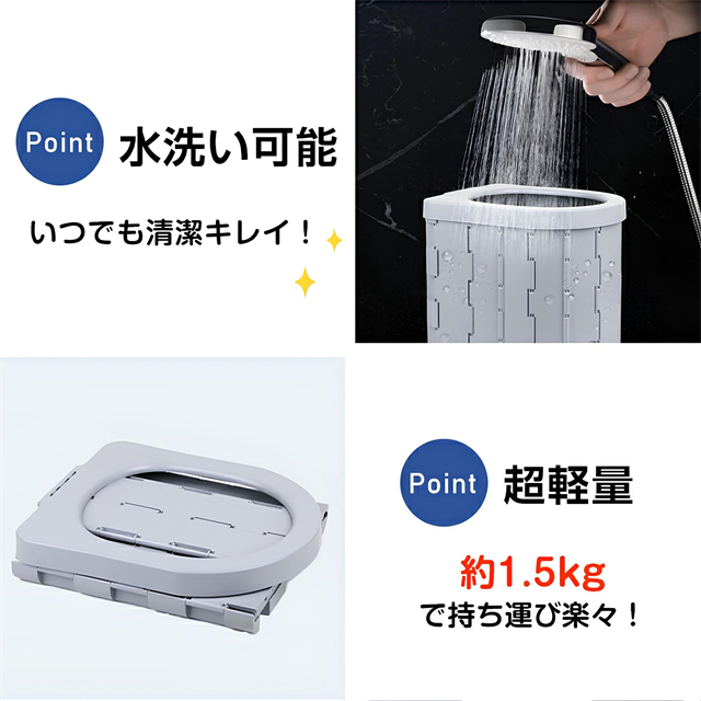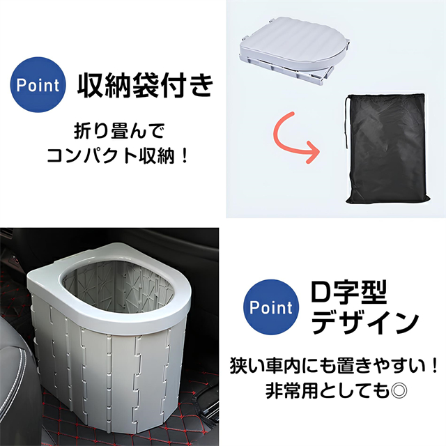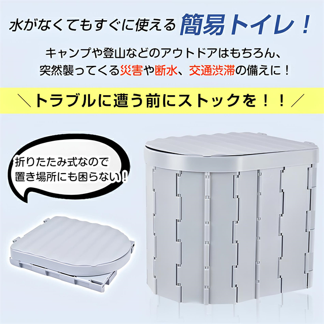 「もし直下大地震がきたら…」「過去最大級の台風が来て、断水したら…」「避難所トイレの衛生環境が…」そんな不安を抱えていますか?災害時、万が一の断水に備えて、簡易トイレは急にトイレが使えなくなった場合に重宝します。防災グッズとして備蓄しておくと安心!片手でラクラク持ち運べるので、キャンプ用トイレやキャンピングカー トイレとしてもおススメです。