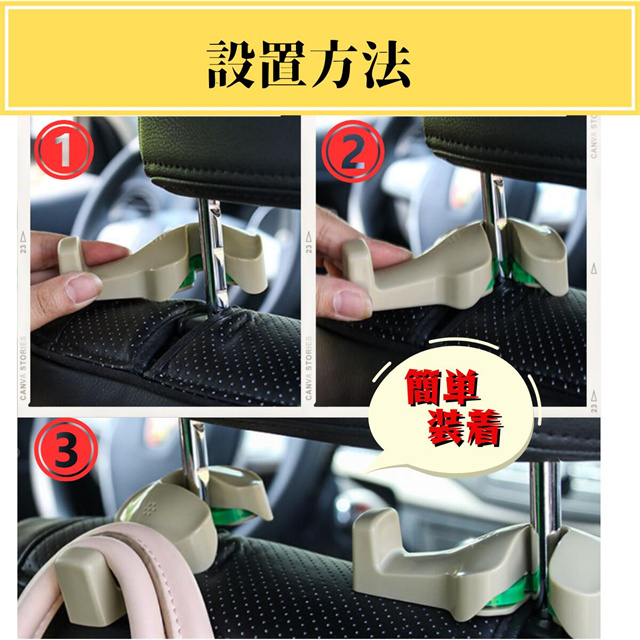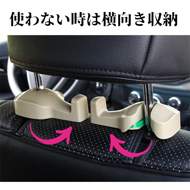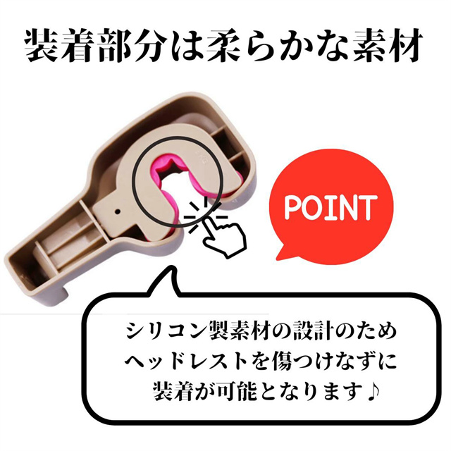 車内のヘッドレストに簡単に装着が可能♪使わない時は横向きにして収納が可能なので邪魔にならない便利設計!フックの大きさも大きすぎず使いやすいコンパクトサイズになってます。フックの内側は柔らかなシリコン設計となっているため、車のヘッドレストを傷つける心配はありません。