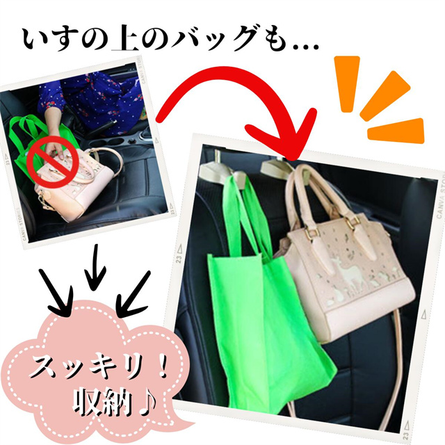 買い物袋や通園バッグなどを足元に置くと汚れが目立ってしまいますよね。車用フックを使用することで、今まで足元に置いてあった荷物を下に置くことなく利用が可能になります♪
