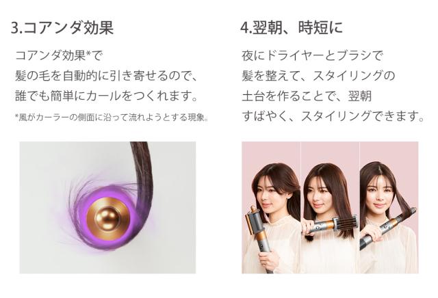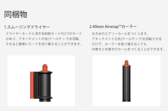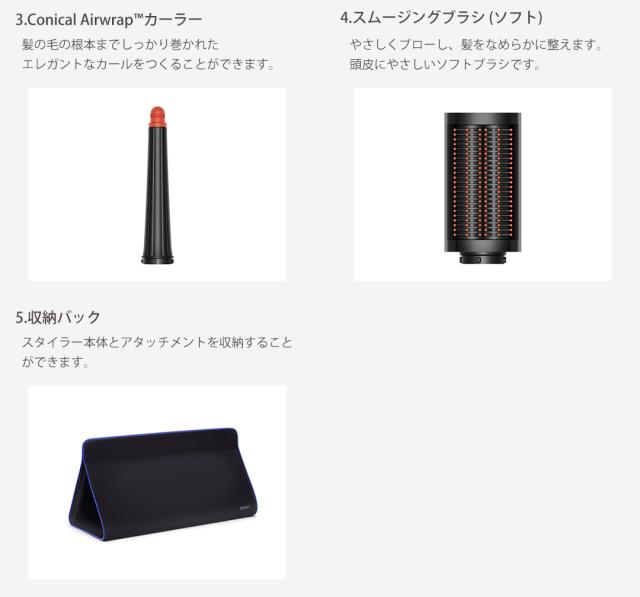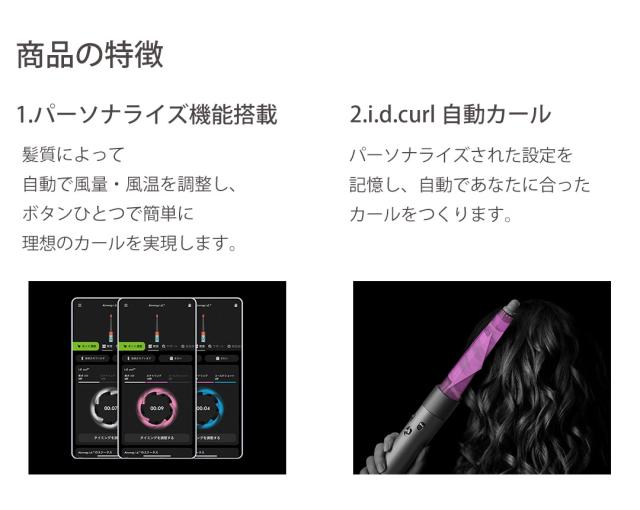 ●ダイソン初。MyDysonアプリ対応のヘアケア製品 Dysonアプリで簡単な質問に答えるだけで、あなたの髪質にあったカールをパーソナライズ。i.d. curlとしてアプリ内に記憶され、自動的に簡単カールができるようになります。 ●コニカル Airwrapカーラー 新しいコニカルバレルは、先が尖った形状で根本までしっかりと巻くことができます。 ●40mm Airwrapロングカーラー 小さめのエアリーカールをつくります。アタッチメントの先(クールチップ)を回転させるだけで、カーラーを取り換えなくても、内巻き・外巻きのカールをそれぞれつくることができます。 ●スムージングドライヤー 新しいスムージングドライヤーは集中させた風ですばやく、効率的に髪を乾かすことができます。 ●スムージングブラシ(ソフト) やさしくブローし、髪をなめらかに整えます。頭皮にやさしいソフトブラシです。 ●浮き毛を抑制 新しいスムージングドライヤーは、コアンダ効果で長い髪の毛を手前に引き寄せ、髪表面の浮き毛を目立たなくします。 ●マイナスイオン 気流の中のマイナスイオンが、髪の静電気を抑えます。 ●ダイソン エアラップ 一般的なスタイリングツールは、過度な熱で髪内部の水素結合を切り形状を変えるのに対し、ダイソン エアラップは、濡れた髪の水素結合が切れている状態を利用し、髪を乾かしながらスタイリングします。 ●コアンダ効果 カーラーは周囲に発生するコアンダ気流を継続的に送り出し※、髪を自動的に引き寄せてカールをつくります。アタッチメントの先を回転させるだけで、カールの向きを簡単に切り替えられます。 ●エアリーカール、ブロー、ドライ、浮き毛抑制も 1台で アタッチメントが豊富なのでさまざまな髪の長さに対応しており、家族での使用にも適しています。過度な熱に頼らないので、お子様の髪のように細く、熱に敏感な髪質の方にもお使いいただけます※。 ※本製品の使用に際しては、保護者の指示・監督を受けない限り、お子様が単独で使用したり、遊ばないよう注意を払ってください。詳細は取扱説明書をご参照ください。 |