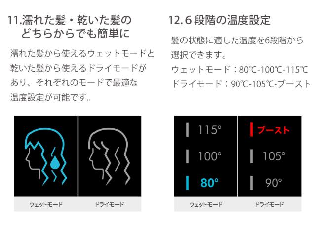 ●濡れた髪を乾かしながらストレートにスタイリングする「ウェットモード」 高温プレート、ブラシ、過度な熱などを使わずに、濡れた髪の状態からストレートにします。水分と気流を組み合わせることで、過度な熱によるダメージから髪を守り、効果的にスタイリングができます。 ●乾いた状態の髪をお直しする「ドライモード」 乾いた状態の髪をお直ししたり、スタイリングすることもできます。髪質に応じて風温を選択できます。 ●セルフクリーニング 電源を入れるたびに3秒間、冷風を噴射し、本体のアーム内をきれいにします。 ●アラート 本体のディスプレイには、フィルターユニットの掃除時期など、メンテナンスに関するお手入れの時期が表示されます。 ●アイドリング機能 本体を髪に通すとき以外は、自動的に弱い風に切り替わるため、スタイリングが効率的に行えます。 ●自動一時停止 3秒間使用しないと、本体は一時停止します。* *アームのロックが解除されている場合。 |