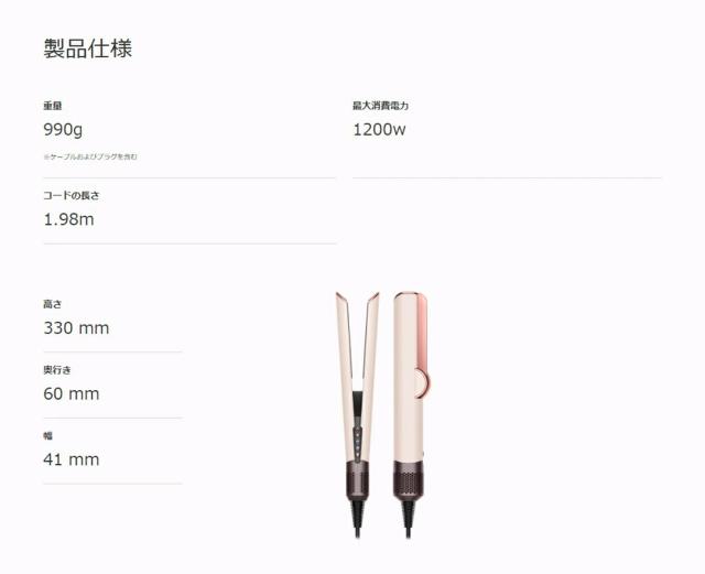 Dyson Airstrait 風の力で自然なストレートへ導く、ストレートドライヤー。 本体カラー:セラミックピンク/さくらチェリー/ダークブルー 定格消費電力:1200W ボルト数:100V 風量調整(段階):2段階(低、高) 風温調整(段階):6段階 通常時の使用最高温度:115度 温度過昇装置作動温度:135度 本体サイズ(高さ×幅×奥行き):60 × 41 × 330mm 本体重量:990g ケーブルコードの長さ:1.98m 本体同梱付属品:耐熱マット |