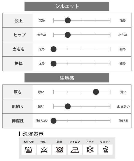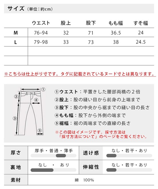 | サイズ | ウエスト | 股上 | 股下 | もも幅 | 裾幅 |