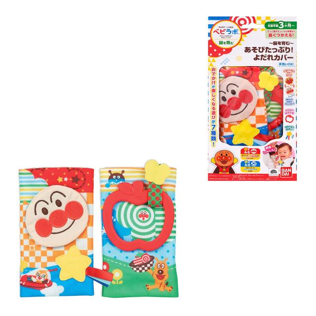 アンパンマンの知育トイシリーズベビラボから、楽しい遊びがいっぱいで、抱っこのおでかけがもっと楽しくなるアンパンマンのよだれカバー。脳科学検証に基づいた、赤ちゃんが見分けられる模様や表情がデザインされている。