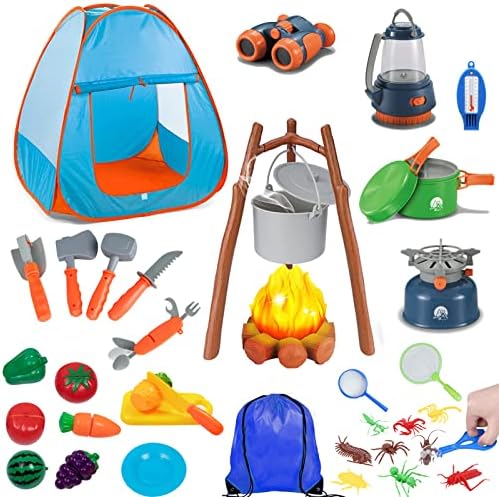 (豪華な38点セット)このキャンプテントセットはアウトドアやキャンプが好きな子供たちのために設計されています。豪華な38点セット:折り畳めるテント、キャンプファイア、 支柱、鍋、2-in-1ランタン・懐中電灯、コンロ、双眼鏡、多機能鍋(フライパン,弁当箱,鍋)、多機能ナイフ・フォーク、多機能ホイッスル(ホイッスル,拡大鏡,コンパス)、斧、ハンマー、ナイフ、シャベル、野菜、果物、昆虫、昆虫採集キット( 虫取り網、バグ転送ツール、3倍の拡大鏡)は様々なコスプレできます。キャンプ/キャンプファイア/おままごと/バーベキュー/昆虫採集など子供たちは自分の想像力で様々な模擬ゲームが体験できます。