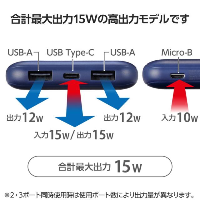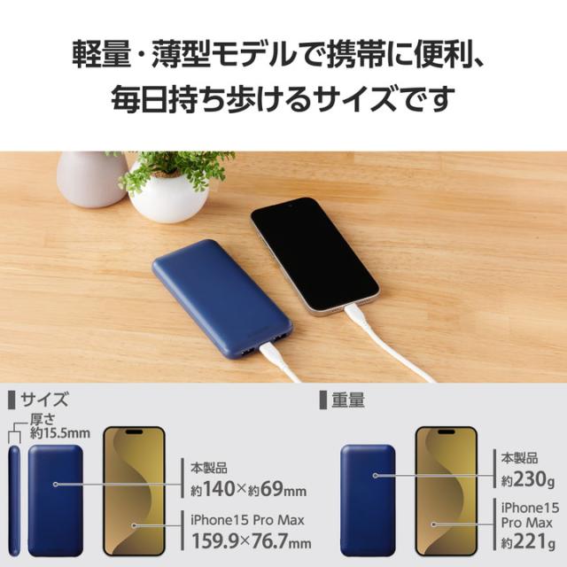 安心の大容量×薄型で長時間の外出にぴったり。3ポート出力可能な10000mAhモバイルバッテリーです。手になじむラウンド形状と薄型コンパクト設計で重ね持ちしやすいデザインです。![]() ■たっぷり使える10000mAhで長時間の外出時も安心。持ち運びしやすい薄型形状のモバイルバッテリーです。 ■USB-Aポート×2、USB Type-C(TM)ポート×1の3ポートから出力可能。USB-Aポートからは最大12W、USB Type-Cポートからは最大15Wで充電できます。 ■※それぞれ単ポート使用時の出力です。2ポート・3ポート同時使用時は使用するポートにより出力量が異なります。 ■本製品(バッテリー容量10000mAh)で、1800mAhのスマートフォンを約3.3回、3000mAhのスマートフォンを約1.9回充電可能です。 ■※満充電した本製品で電源オフの状態のスマートフォンを充電する際の目安回数です。充電中に電源を入れたり、機器を使用したりしている場合は記載の数値まで充電できない場合があります。 ■手になじむラウンド形状で、スマートフォンと重ね持ちしやすい薄型モデルです。 ■本製品はUSB Type-Cポート・USB Micro-Bポートから充電可能。USB Type-Cは最大15W、USB Micro-Bポートは最大10Wでの入力が可能。残量ゼロから約6時間で充電できます。 ■※USB Type-Cポートから製品本体のみを充電した場合の目安です。スマートフォンなどのモバイル機器を同時に接続した場合は記載の時間では充電できません。 ■本製品とスマートフォンを同時に接続することで、両方をまとめて充電できる“まとめて充電”に対応しています。 ■※スマートフォンへ優先的に充電されます。スマートフォンの充電が完了すると本製品に充電されます。 ■※接続機器によっては本製品への充電が優先され、スマートフォンへの充電に時間がかかる場合があります。 ■電池残量は4段階のLEDランプ点灯で確認可能です。 ■約500回繰り返し使用可能な充電式リチウムイオン電池を搭載しています。 ■内蔵の充電式リチウムイオン電池は、JIS C8711およびJIS C8712(JIS C8714の内容を含む)に準拠した安全設計です。 ■USB-IF指定の試験に合格した信頼性の高いUSB Type-Cコネクターを搭載していますので安心・安全に使用できます。 ■日本の電気用品安全法(PSE)の技術基準に適合した安全性の高い商品です。 ■過充電・過放電・短絡・過電流・温度検知の5つの保護機能を備えた安心の回路設計です。 ■電池容量が160Wh(43,243mAh)以下であるため、機内持ち込みも可能です。 ※航空会社の規定によって例外がある場合があります。 ■持ち運びに便利な約10cmのUSB Type-C - USB Type-Cケーブルを付属しています。 ■※USB Type-C - USB Type-C以外の充電ケーブルは同梱していません。別途ご購入またはご用意ください。 ■※工場出荷時に70%程度充電されています。充電式リチウムイオン電池は時間とともに放電するので、ご使用になる前に充電することを推奨します。 ■※ケーブルを挿したままにするとバッテリーの残量が減ってしまいます。使用しない場合は必ずケーブルを外してください。 ■※充電対応機種はエレコムホームページの対応表をご確認ください。 ■※USB Type-C and USB-C are trademarks of USB Implementers Forum. ■本製品は、一般社団法人JBRCの回収対象製品であり、回収協力自治体や協力店(家電量販店・ホームセンターなど)で回収が可能です。 ■※JBRCのホームページでお住まいの地域の回収協力自治体・協力店をご確認ください。 ■自社環境認定基準を1つ以上満たし、『THINK ECOLOGY』マークを表示した製品です。 ■環境保全に取り組み、製品の包装容器におけるプラスチック重量を、社内基準製品より20%以上削減した製品です。 ■環境保全に取り組み、製品本体の主たる構成部品や構成要素の原料に占めるリサイクル原料の割合が10%を超えている製品です。 ![]() ■対応機種:iPhoneおよびUSB端子で充電するスマートフォン、タブレット、他小型電子機器 ■コネクター形状(電源入力側):USB Type-C(TM)ポート、USB Micro-Bポート ■定格入力電圧:5V ■定格入力電流:USB Type-C:3A、USB Micro-B:2A ■コネクター形状(電源出力側):USB Type-Cポート×1、USB-Aポート×2 ■定格出力電圧:単独接続時:5V、2ポート同時接続時:5V、3ポート同時接続時:5V ■定格出力電流:2ポート同時接続時(USB Type-C+USB-A1、USB Type-C+USB-A2):3A(合計最大出力15W)、2ポート同時接続時(USB-A1+USB-A2):2.4A(合計最大出力12W)、3ポート同時接続時:3A(合計最大出力15W) ■電池種類:充電式リチウムイオン電池 ■電池定格容量:3.7V/10000mAh 37.0Wh ■充電時間:約6時間 ※製品本体のみを充電した場合の目安です。スマートフォンなどのモバイル機器を接続した場合は記載の時間では充電できません。 ■外形寸法:幅約69mm×奥行約15.5mm×高さ約140mm ■重量:約230g ■カラー:ブルー ■くり返し使用回数:500回 ■付属品:USB Type-C - USB Type-Cケーブル(0.1m) ■環境配慮事項:使用温度:0〜40℃ ■電気用品安全法:○PSE 特定以外の電気用品 ■保証期間:1年間 ■その他:Lightningポート搭載機器で使用する場合は、別途Lightningケーブルをご用意くだ