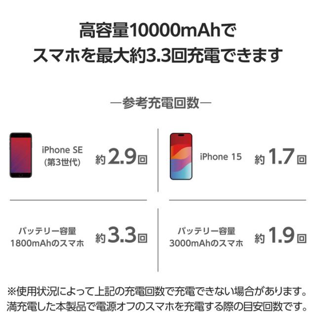 安心の大容量×薄型で長時間の外出にぴったり。3ポート出力可能な10000mAhモバイルバッテリーです。手になじむラウンド形状と薄型コンパクト設計で重ね持ちしやすいデザインです。