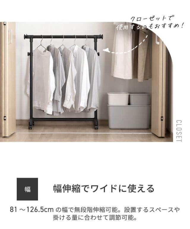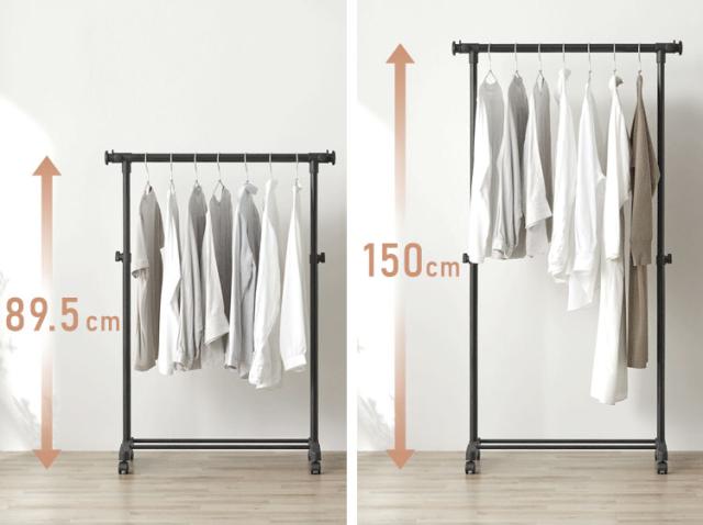 (検索用:ハンガーラック・おしゃれ・ブラック・パイプハンガー・洋服掛けラック・1段・シングル・横幅伸縮・高さ調整・ロングコート・子供服・キャスター付・4967576734813・4967576734820・4967576734837・アイリスオーヤマ)