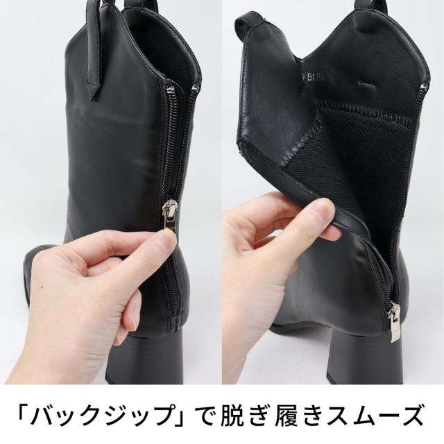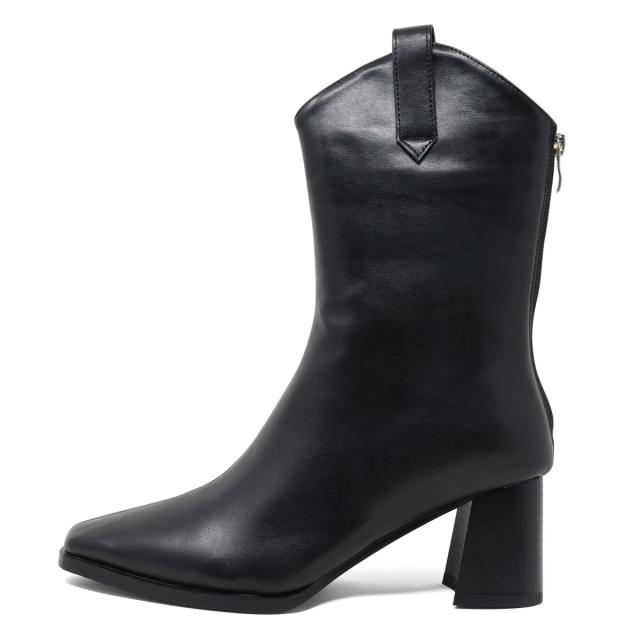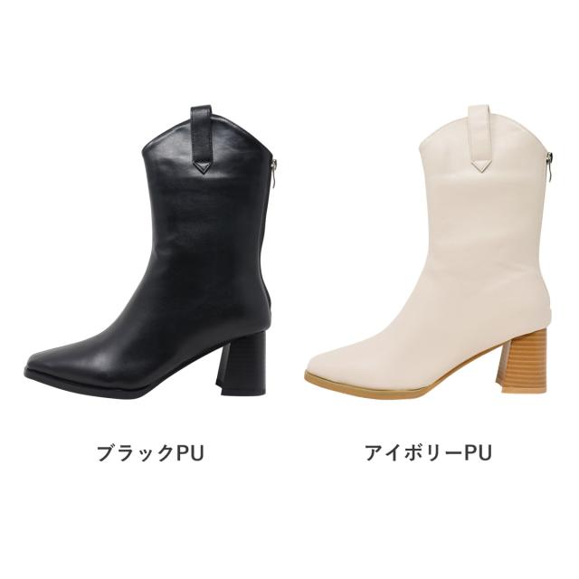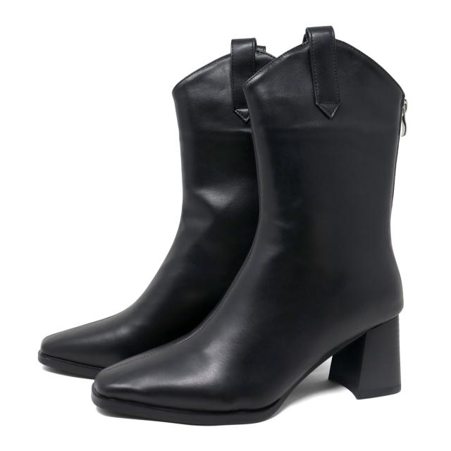 ブーツ レディース スクエアトゥ 6cmヒール チャンキーヒール ミドル丈 ウェスタンブーツ バックジップ 合皮 黒 22.5-24.5cm リバティードール No.9129 秋 冬
