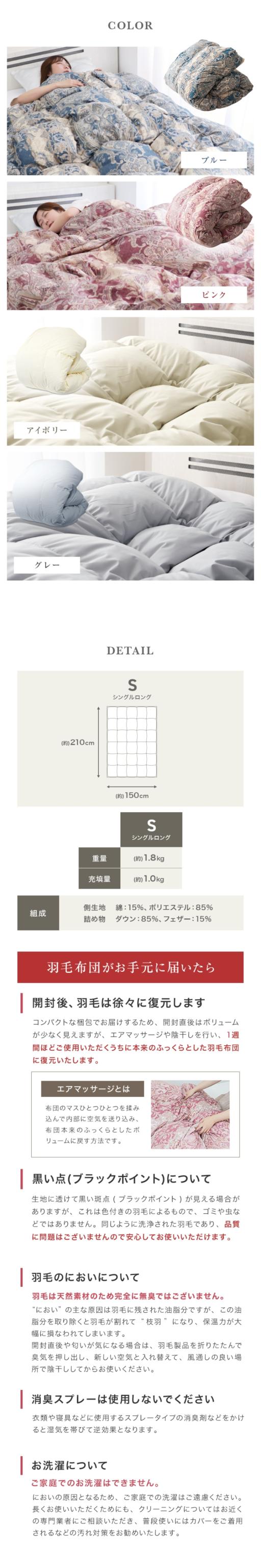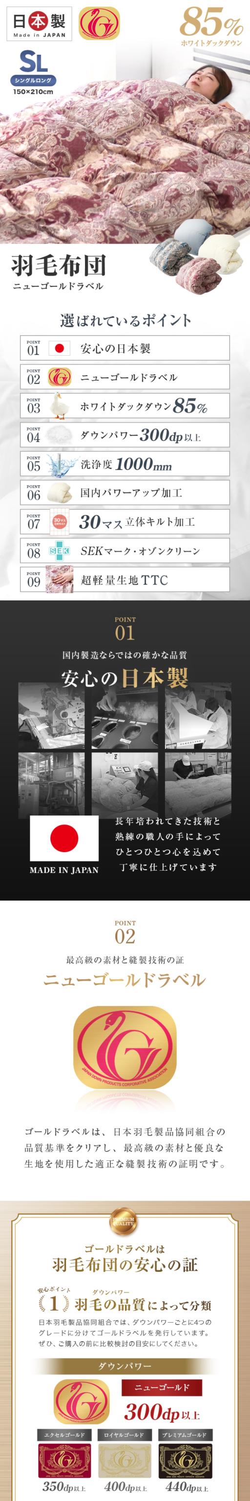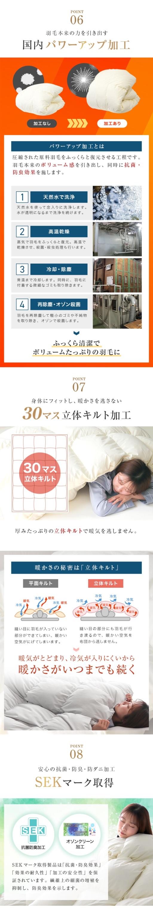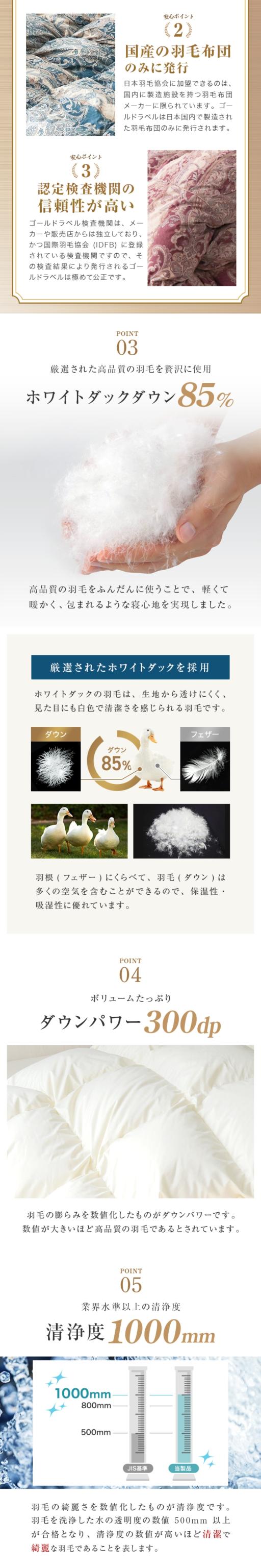 | 特徴 | 安心の日本製 ニューゴールドラベル ホワイトダックダウン85% ダウンパワー300dp以上 業界高水準の洗浄度1000mm 国内パワーアップ加工 30マス立体キルト加工 SEKマーク取得 オゾンクリーン加工 抗菌・防臭・防ダニ加工 超軽量TTC生地を使用 二重縫製 ダウンプルーフ加工 布団留めループ 8箇所付き |