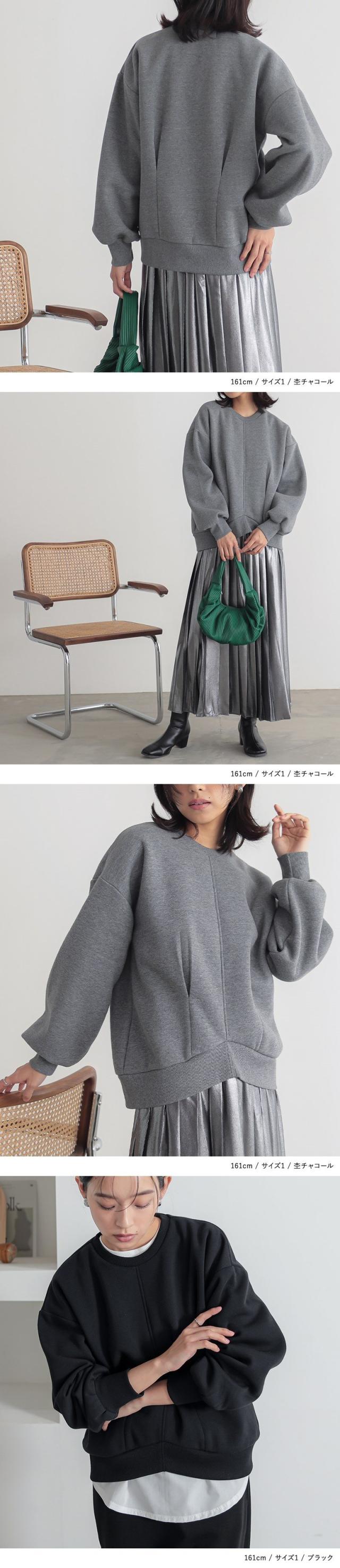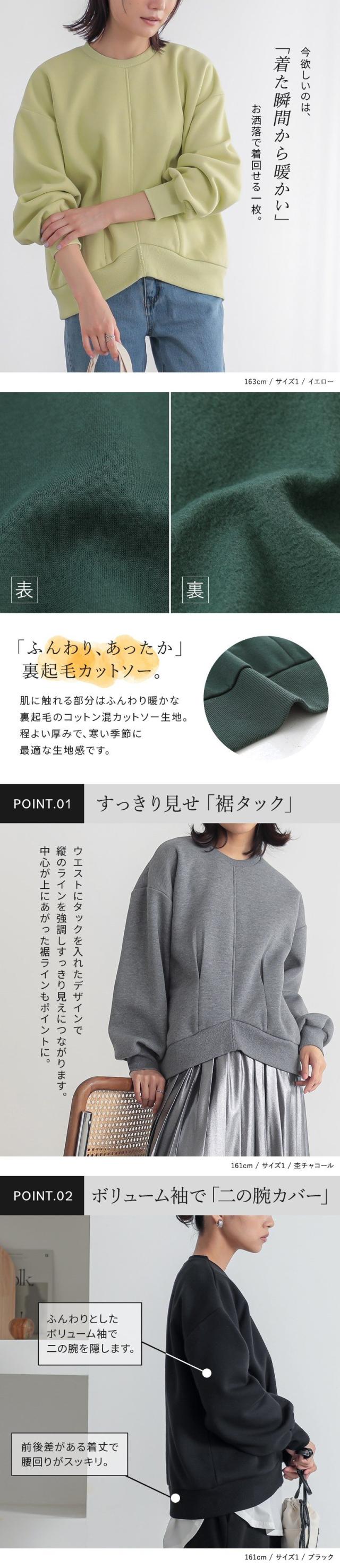 『裏起毛裾タックプルオーバー』【メール便不可】【40】[スウェット 長袖 レディース トップス 裏起毛 あったか トレーナー タック プルオーバー ショート丈 伸縮性 着回し ボリューム袖 体型カバー]