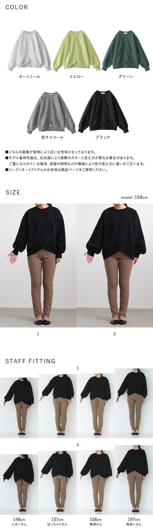 | staff:Z/155cm B79 W65.5 H86 【普段着用】 Tops: S/M Bottoms: S/M | 【1】 袖丈:手の甲真ん中位 着丈:ヒップ真ん中より下位 腕周り:ゆったり バスト:ゆったり 全体:ゆったり ゆったり楽に着られました。 【2】 袖丈:手の甲が隠れる位 着丈:ヒップ下少し見える位 腕周り:大きい バスト:大きい 全体:大きい ゆったり着られました。 私の場合は、1を選びます。 |