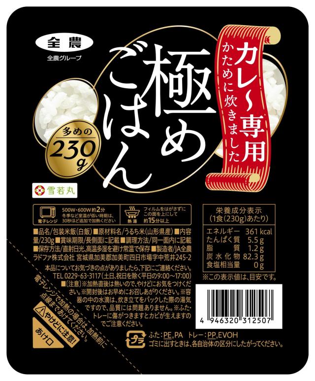 説明 商品紹介 レトルトカレーとパックごはんの生産量が年々増加していること、市場調査によるとパックごはんを食べるときのメニューはカレーが最多であることから、カレー専用ごはんを開発しました。 しっかり食感が特徴の「雪若丸」を使用し、程よくかために炊き上げた、カレーによく合うパックごはんです。 JA全農ラドファ独自の「シャリ切り製法」により、ふっくらほぐれやすいごはんとなっており、ルーともよく絡みます。 内容量はレトルトカレーより少し多めの230gです。 原材料・成分 国産うるち米100%