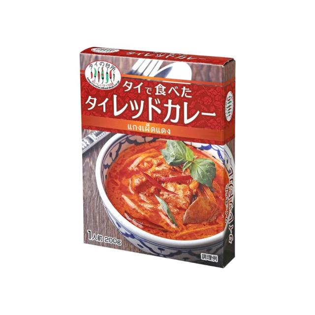 【原材料】ココナッツミルク、鶏肉、レッドカレーペースト(唐辛子、にんにく、レモングラス、シャロット、食塩、ガランガル、カフィアライムの皮、クラチャイ、クミンパウダー)、たけのこ、砂糖、大豆油、魚醤(魚介類)、食塩、タピオカデン