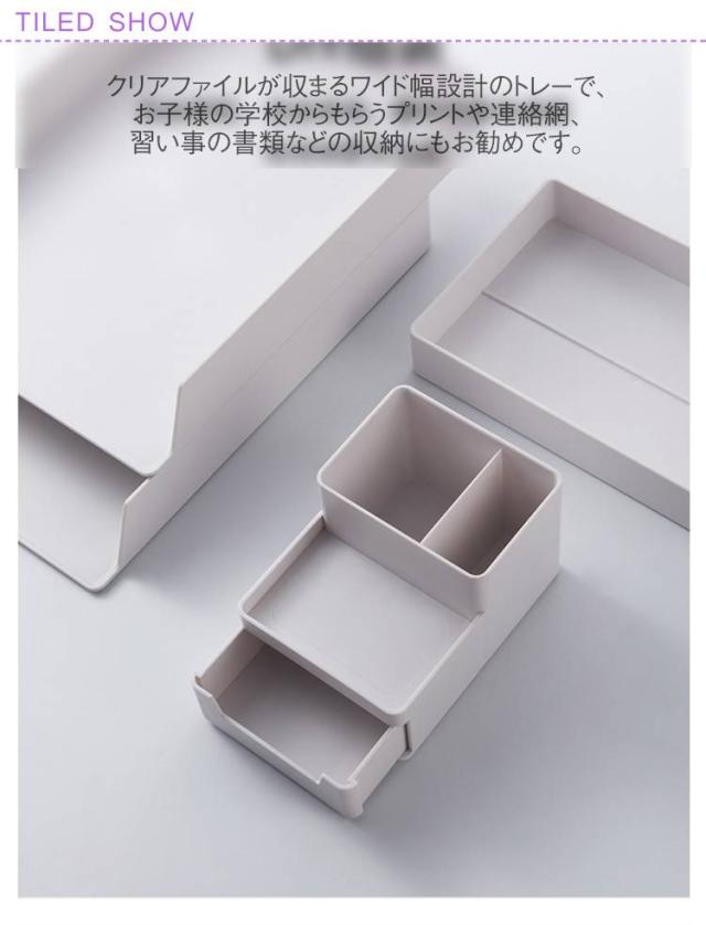 | セミナーやイベント会場の配布プリントやチラシケース、ペン立てにも活用いただけます。 単体使いも出来るので、ご家族や同僚と分けて使うのもok クリアファイルが収まるワイド幅設計のトレーで、お子様の学校からもらうプリントや連絡網、習い事の書類などの収納にもお勧めです。 職場のデスクや共有場所の書類フォルダーにも最適! 机の上がいつもきれいに維持できる便利な収納ツールで、置く場所を決めることですっきり! A4サイズ対応のデスクトレーです。 省スペース収納に適切なコンパクト設計で組み合わせが自由に変えられるので、利便性が高い! | |