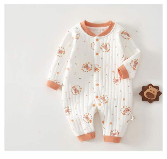 | ナチュラル綿素材の3重構造で仕上がったの中綿ロンパース。 綿の素材のやわらかな生地なので、着心地が快適。 スナップボタンの前開きで、お着替えやオムツ交換が楽ちん、ご出産準備やお祝いのギフトにもおすすめ。 | |