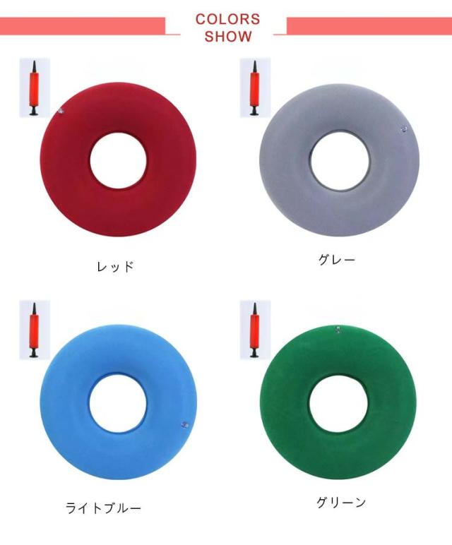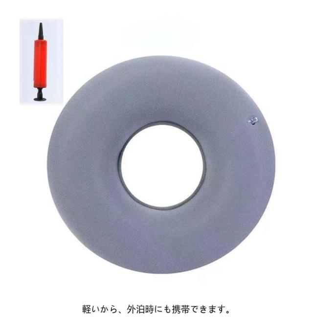 | お尻にやさしいドーナツタイプの丈夫なPVC製ソフトクッション 時間の使用でも疲れにくく、いつでもどこでも快適な座り心地です! エアークッションタイプだから座り心地をアレンジできます。 長時間のデスクワーク、レジャー、旅行、床ずれ、痔、おでき等でお悩みの方の、お尻や腰への負担をやわらげます!! 軽いから、外泊時にも携帯できます。 | |