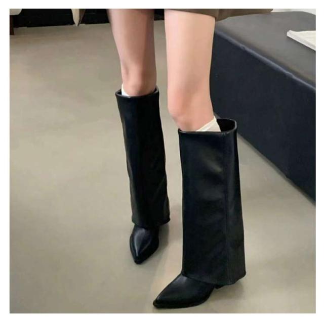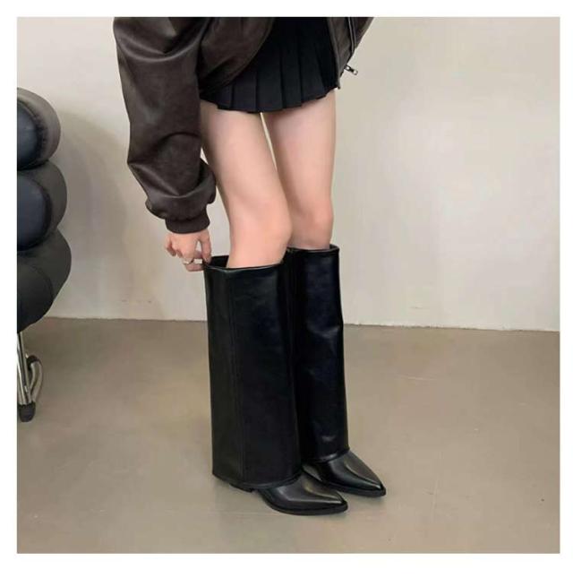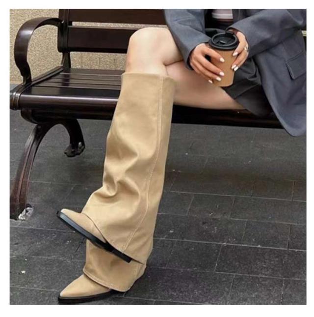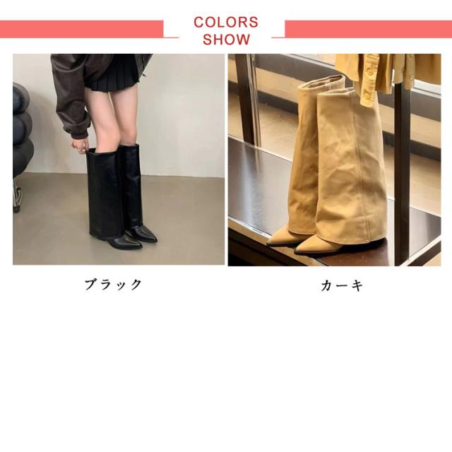 ロングブーツ 痛くない レディース ポインテッドトゥ フレアカバー レイヤードカバー 歩きやすい ロングブーツ ローヒール PUレザー 合成皮革 靴