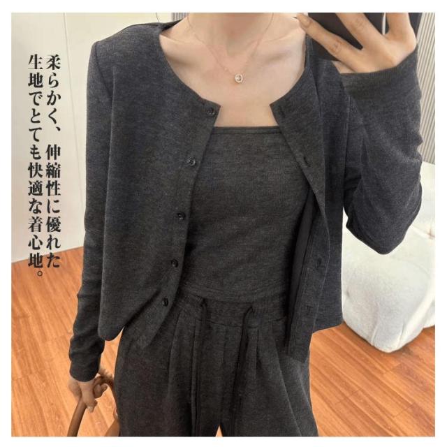 スウェット ショート丈 秋服 キャミソール+カーディガン+ワイドパンツ 上下セット 羽織り 上着 レディース セットアップ 3点セット カーデ 薄手 ルームウェア 部屋着 オフィスカジュアル 通勤 カジュアル