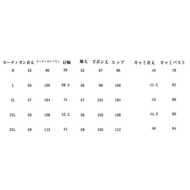 | サイズについての説明 | 3点セット内容:キャミソール+カーディガン+ズボン ※サイズ表の実寸法は商品によって1-3cm程度の誤差がある場合がございます。 |