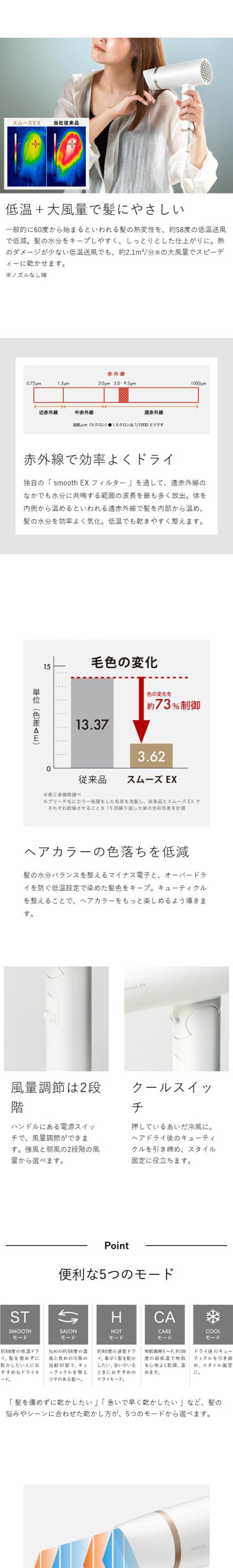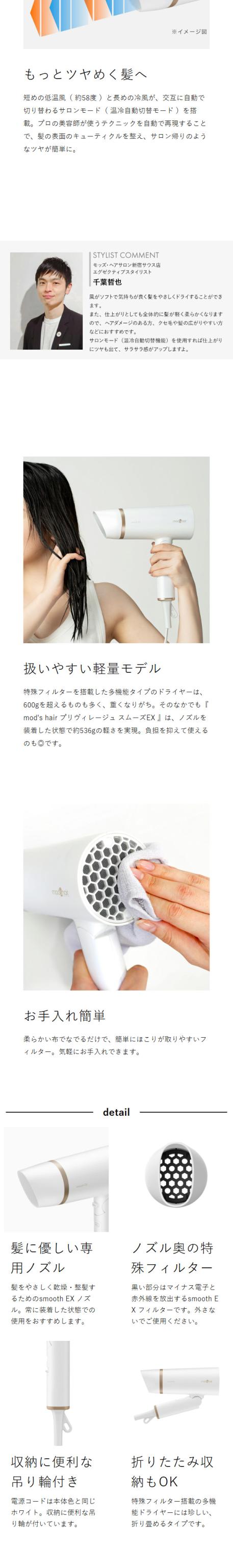 ツヤめく高機能ドライで しっとりまとまる美髪へ 『 mod's hair プリヴィレージュ スムーズEX 』は、つるんとまとまる美髪に導くヘアドライヤー。マイナス電子・低温・大風量・赤外線による独自のスムーズEXシステムで、オーバードライを防いでしっとりとした仕上がりに。ボタンひとつで選べる5段階のモードは幅広い温度設定で、ヘアドライもスタイリングもお好み次第。髪に優しく乾かせて、ヘアカラーの色落ちも軽減。頭皮ケアにも対応できる超低温の専用モードも搭載した、多機能な美容ドライヤーです。 ※マイナス電子=負の電荷を帯びた電子