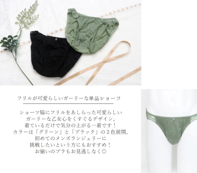 ショーツ脇にフリルをあしらった可愛らしいガーリーな乙女心をくすぐるデザイン。着ているだけで気分の上がる一着です!カラーは「グリーン」と「ブラック」の2色展開。初めてのメンズランジェリーに挑戦したいという方にもおすすめ!お揃いのブラもお見逃しなく◎