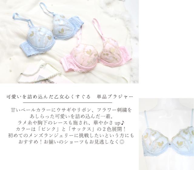 甘いペールカラーにウサギやリボン、フラワー刺繍をあしらった可愛いを詰め込んだ一着。ラメ糸や胸下のレースも施され、華やかさup♪カラーは「ピンク」と「サックス」の2色展開!初めてのメンズランジェリーに挑戦したいという方にもおすすめ!お揃いのショーツもお見逃しなく◎