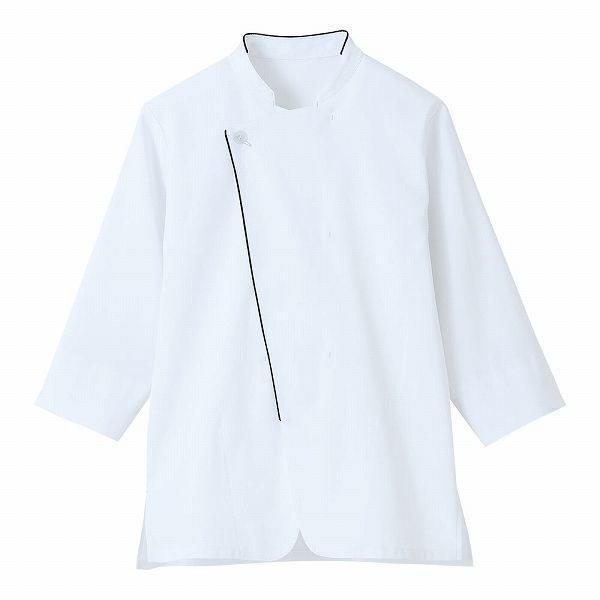 汎用性の高いコックコートをボタンレスにして、カラーパイピングでモダンに仕上げました。