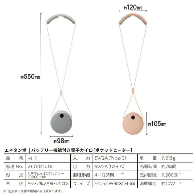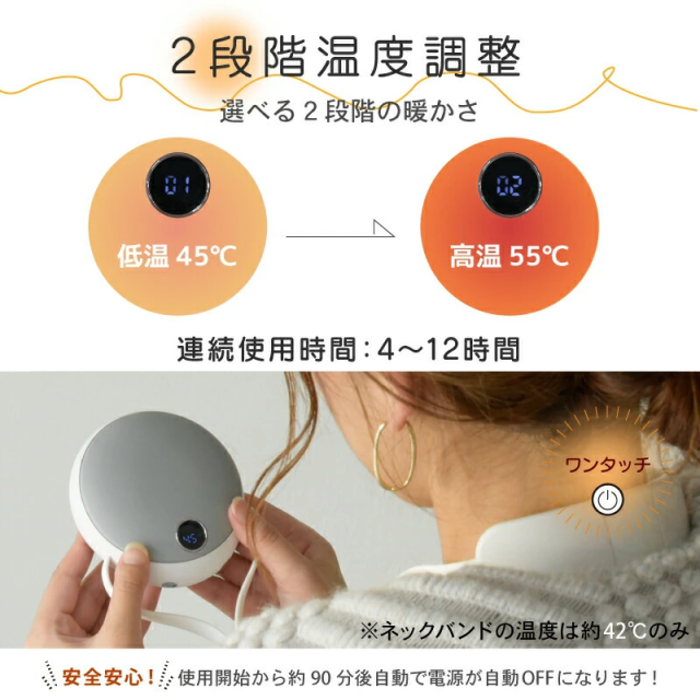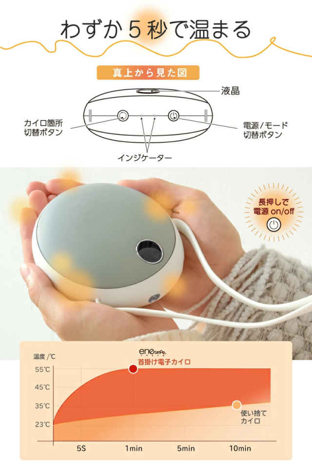 寒さは待ってくれません。電源ボタンを押して、わずか5秒で発熱する優れ物。使い捨てカイロではおよそ5分程度モミモミしなくてはならない手間や時間を全てクリアに。発熱箇所は本体と首後ろの2箇所。本体発熱面が約φ90mmあるので、手先だけではなく、お腹・腰・肩等にも有効です。首かけ式タイプなので、立ったり座ったりのアクティブな仕事や家事をしている方にはとても便利。いつでも暖房を持ち歩き。温度は2段階設定ができ、室内や屋外での使用環境に合わせて温度を切り替えられます。発熱箇所の切り替えは「本体のみ」「本体と首回り」「首回りだけ」の3パターン。バッテリー容量は10000mAhの大容量。暖かさだけではなく、いざというときの非常用モバイルバッテリーとしても活用できます。出力/入力共に5V/2Aの急速充電型の仕様。