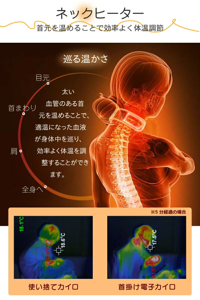 首元のヒートパネルは、太い血管のある周囲を温められるので、適温になった血液が身体中を巡り効率よく体温を調整することができます。目元・首まわり・肩〜全身へ。首まわりのヒートパネルを活用するだけでも、じんわり全身がポカポカ。省エネでおすすめの使い方の一つです!