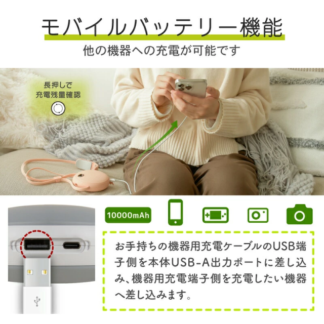 ●たっぷり10000mAhで長時間発熱と非常用のモバイルバッテリーとしても。