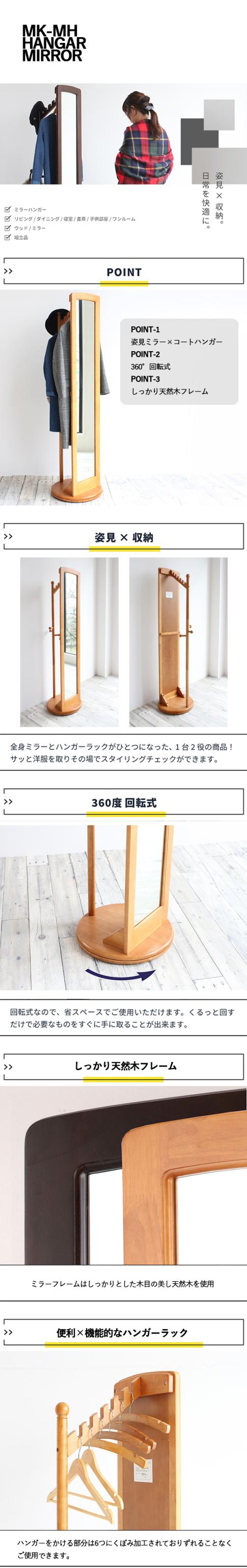 MK-MH 回転式収納付きスタンドミラー ナチュラル木地色・ブラウン色 天然木・メラミン樹脂 幅45×奥行き45×高さ171cm スリムタイプ 組立て商品 ハンガーラック 姿見