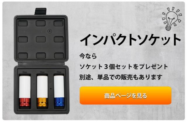 今ならインパクトソケット3個セットプレゼント! ハイパワー・高トルクのバッテリー式インパクトレンチ! ●タイヤ交換から足回り作業まで使用できる、充電式のインパクトレンチです ●高電圧(18V)、大容量(4.0Ah)のリチウムイオンバッテリーを搭載 満充電状態よりタイヤ約40本分のホイールナットを取り外せます ●軽量でコンパクト、長寿命なブラシレスモーターを採用 最大350Nmのトルクを発生させ、強力なパワーを発揮します ●トリガーの引き加減で回転数を調整可能 正逆の回転切替、打撃力3段階切替、緩めすぎストップ機能があります ●エアホースや電源コードなどの取り回しを気にすることなく、いつでもどこでも 使用できます ●電池切れ防止をサポートする電池残容量表示機能付き ●トリガーに連動してドライバーの先端のLEDライトが点灯します ※最大トルクは目安値です、条件によりトルク値は変動します 品番:SET-EIM-10 |