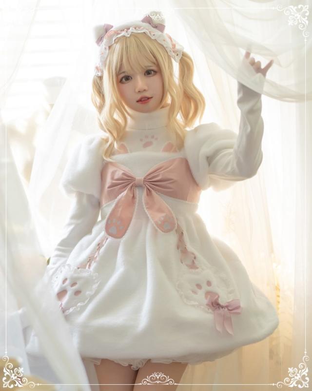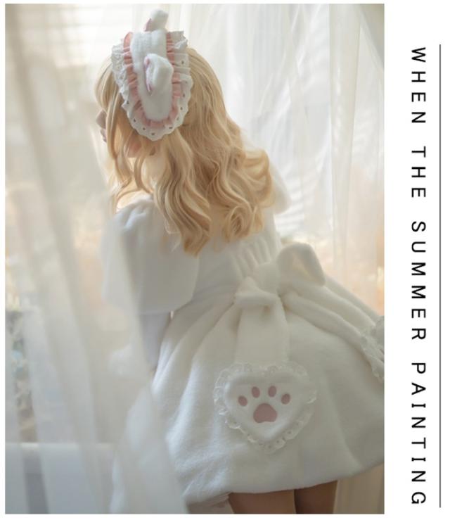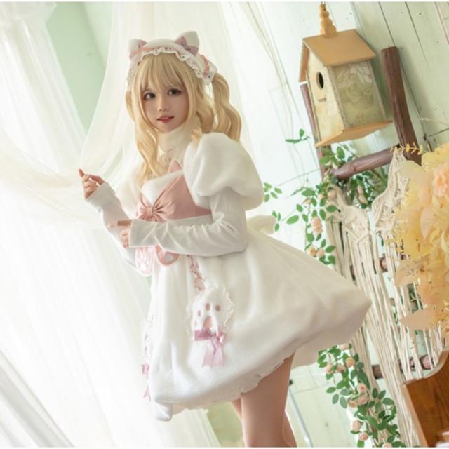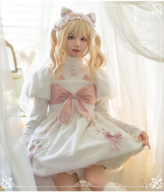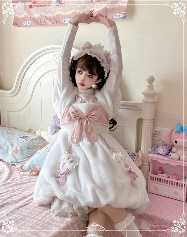 ロリィタ ワンピース 半袖 秋冬 あったか ボア 甘ロリ 肉球 ネコ 猫耳 リボン ゆめかわ ふわもこ もこもこ 姫系 防寒 冬 モコモコ 日系 ソフトガール 可愛い ロリータ パフスリーブアウター 冬服 女 aa142zbzbx7xq aa142zb