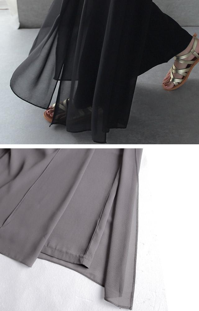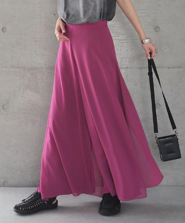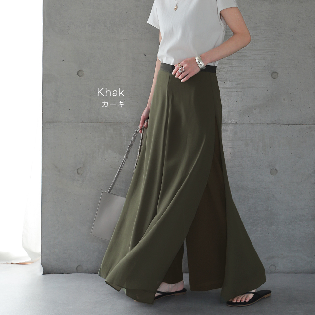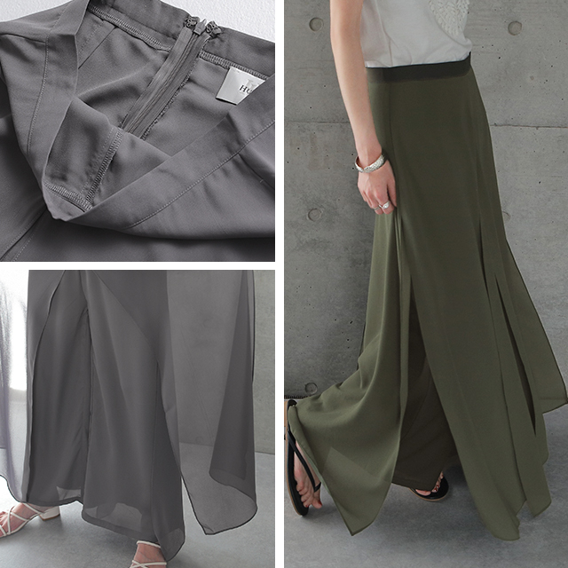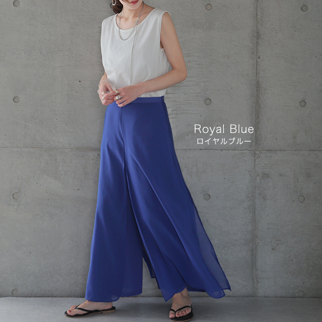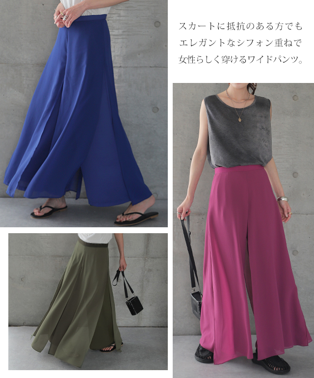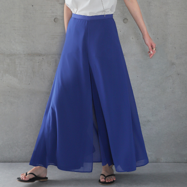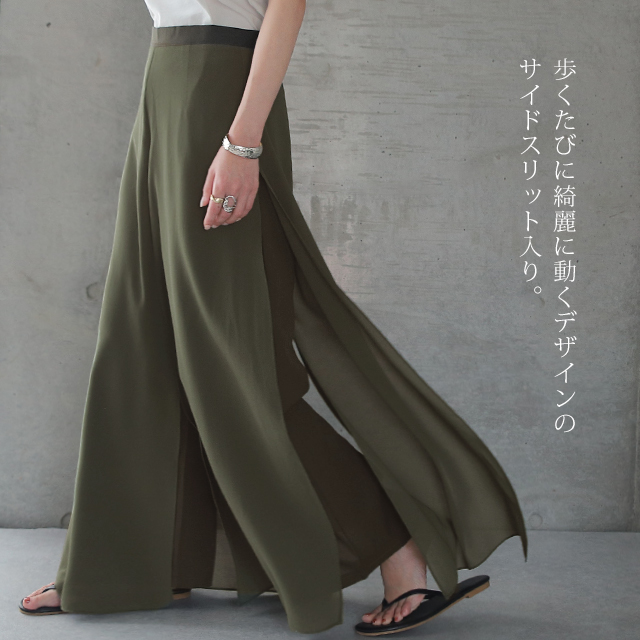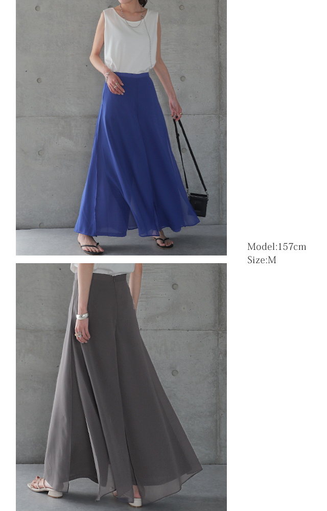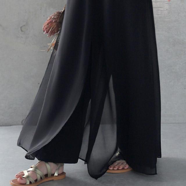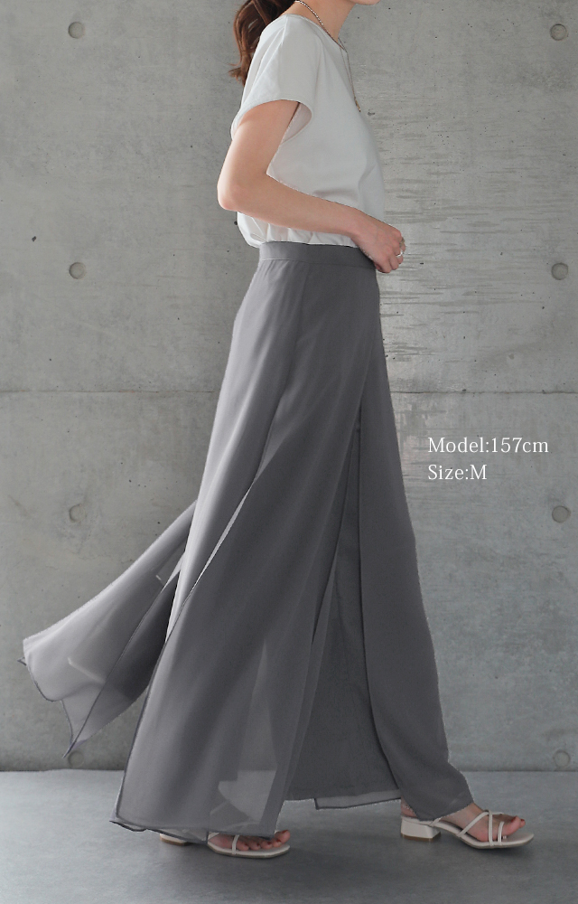 ワイドパンツの上にシフォンが重なっているデザインのパンツです。