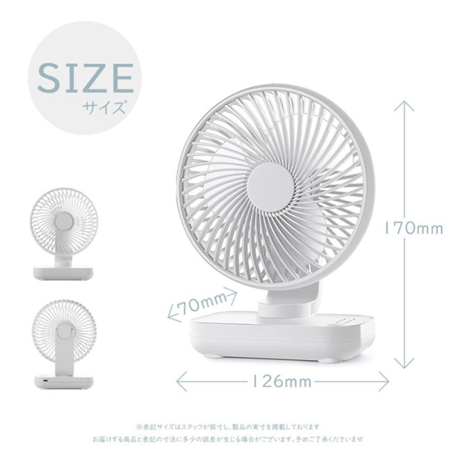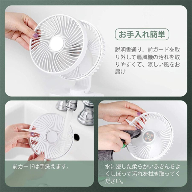 【コンパクトサイズ&お手入れ楽々】卓上扇風機本体の高さは約17cm、重さは約307gと軽量コンパクトサイズ、持ち運びがとても楽です。小さなボディでもパワフル、遠くまでしっかり風を届けます。工具不要、お手入れ可能。扇風機の前ガードが取り外せますので、扇風機の羽根が汚れても、ササッと簡単に拭き取ることができます。ベースの底部には四つのゴムがあるので、両方とも傷をつけていません。